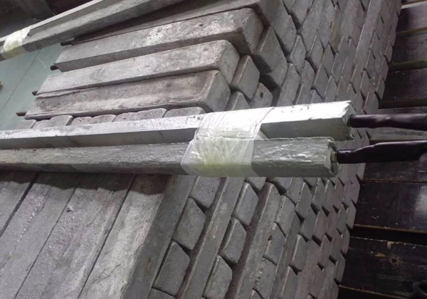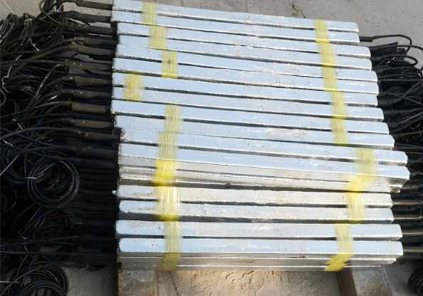 我公司生產的鋅接地電池由平行靠近的一對或四支鋅合金犧牲陽極棒組成,中間用絕緣墊塊隔開,然后一起裝在裝有填包料的棉布袋中,通過引出電纜焊接在絕緣裝置(絕緣接頭或法蘭)的兩側,以防止強電沖擊引起的損壞,同時日常情況下接地電池也可對管道起保護作用。